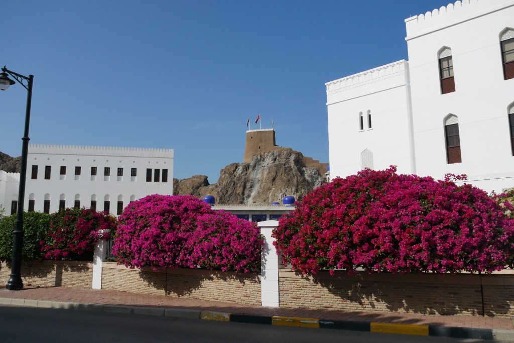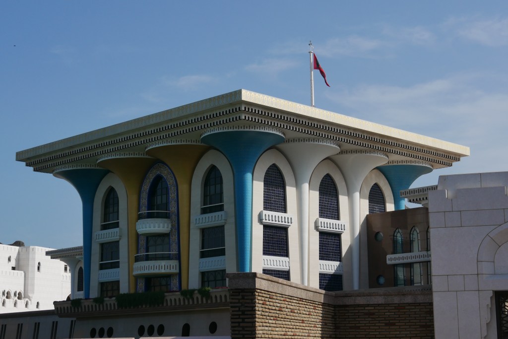 - Observer le palais du Sultan Qaboos : Il n’est malheureusement pas possible de visiter le palais du Sultan mais juste l’extérieur vaut la peine de se déplacer. Le bâtiment est magnifique et nous avons pris le temps de flâner dans les alentours, qui sont très propres et fleuris. Il y a également des forts autour du château mais ceux-ci étaient en travaux lors de notre venue et je ne pense pas qu’il soit possible de les visiter.