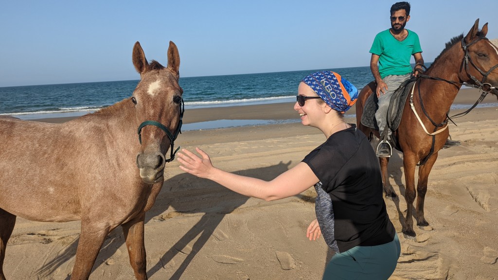 - Aller au bord de la mer : Mutrah n’est pas très grand et on en fait vite le tour alors nous avons pris notre voiture et nous nous sommes arrêtés près d’une plage (Yitti beach il me semble) à quelques kilomètres de Mutrah (trouvée sur Google Maps). L’envie de mettre les pieds dans l’eau était vraiment trop forte et c’est ce genre de moment qui nous fait vraiment prendre conscience : « ça y est, les vacances commencent » 😎 Nous avons en plus eu la chance de croiser des omanais et leurs chevaux, un moment très sympa.