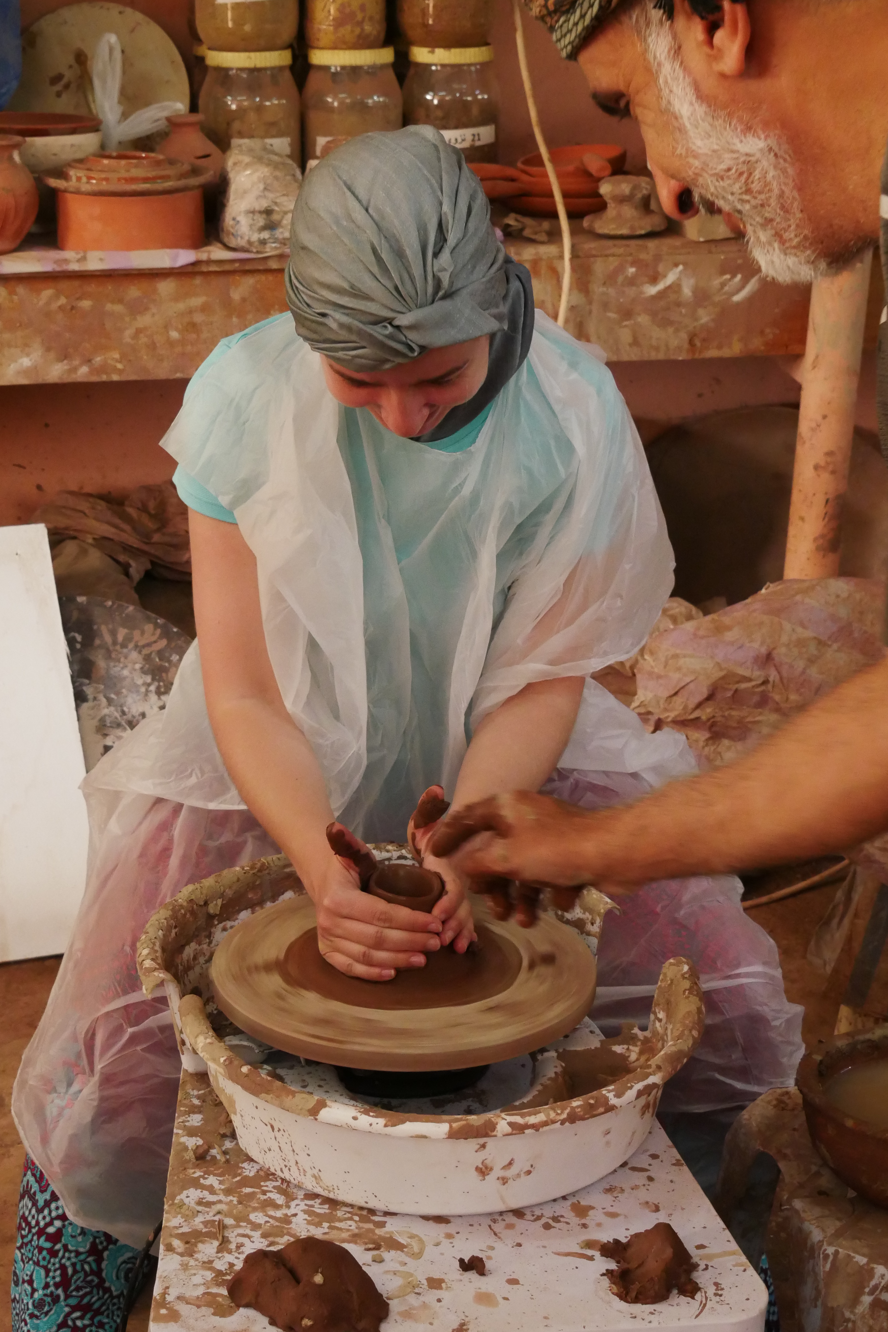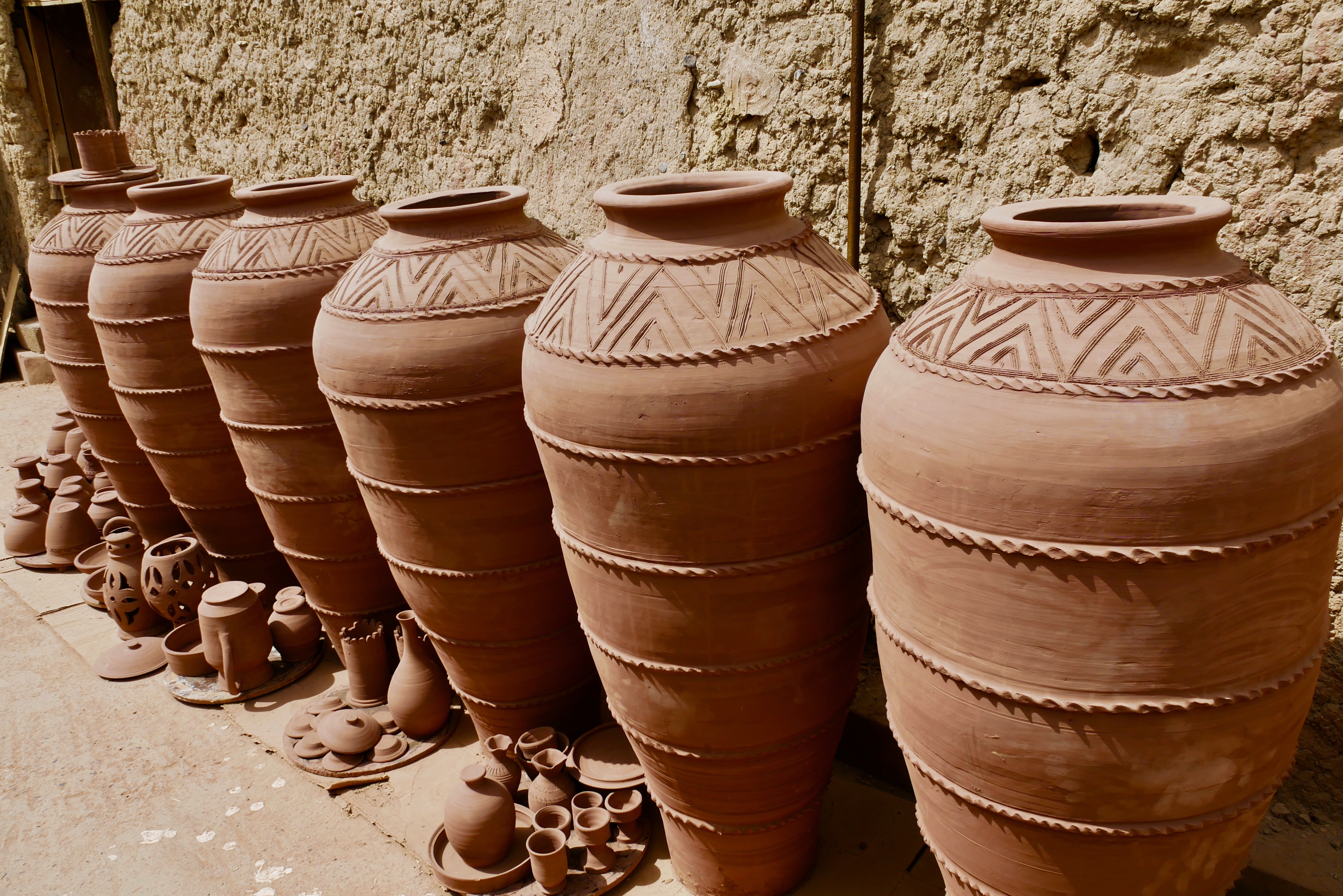 - Aller à la rencontre des potiers de Bahla : La ville regorge de potiers et est d’ailleurs réputée pour cet art. Suite à quelques recherches sur Google Maps, nous décidons de nous rendre au « Aladawi Clay Pots Factory » (nous étions garés au niveau du fort, il a fallu marcher quelques minutes avant de rejoindre cet atelier). Le potier, qui nous a accueilli chaleureusement, nous a expliqué son métier et les différents types d’argile et de pots en fonction des utilisations (pour conserver l’eau fraîche, pour conserver les aliments, pour cuire…). Il m’a même proposé d’essayer de faire un petit bol en poterie. Autant vous dire que j’ai bien galéré et que ça ne ressemblait à rien au final 😂 Une fois mon « oeuvre » terminée, il l’a mise à sécher et l’a fait cuire dans un four. Si je le souhaitais, je pouvais revenir 2 jours plus tard pour récupérer mon bol mais malheureusement, ce n’était pas compatible avec notre planning…