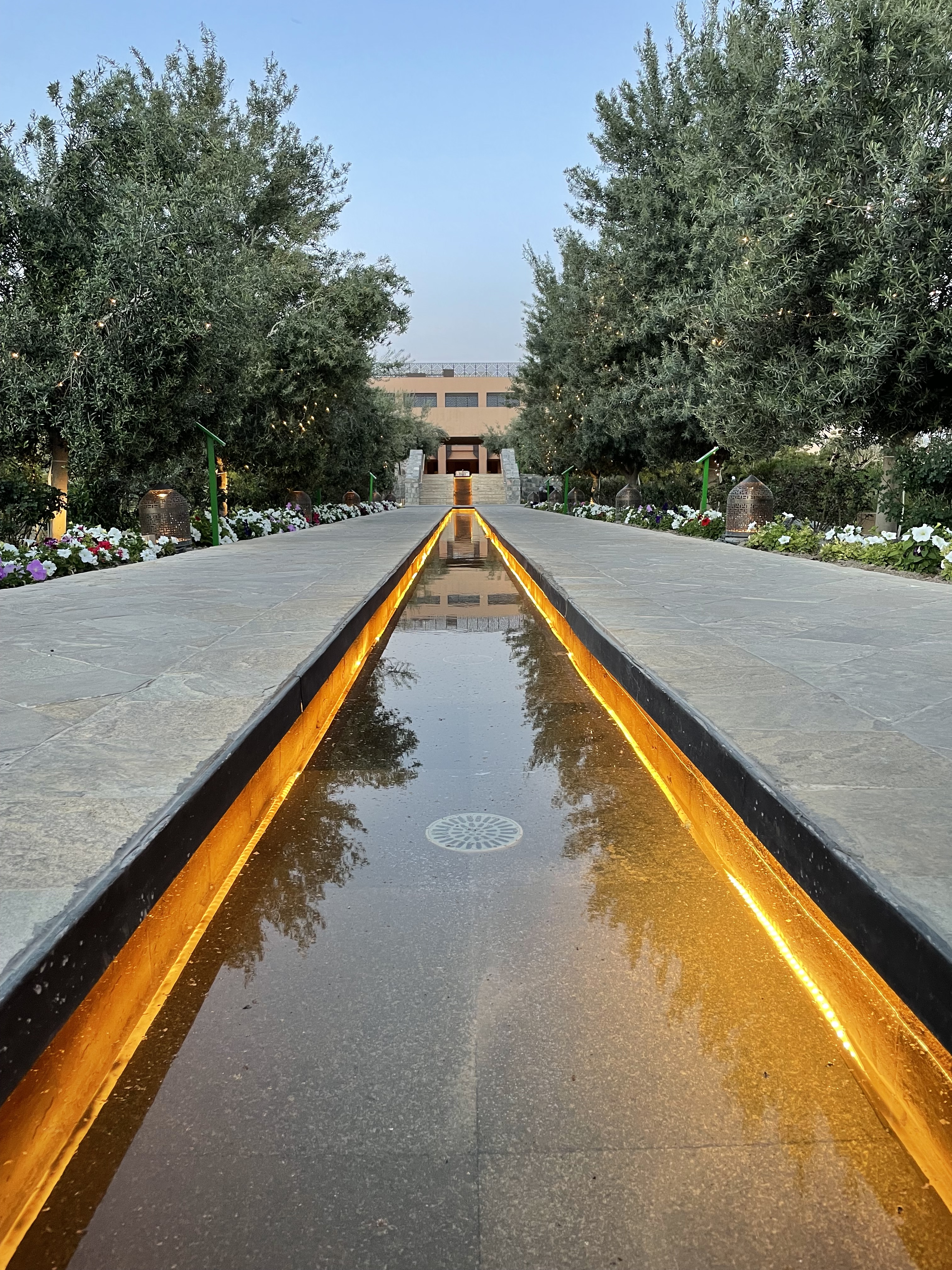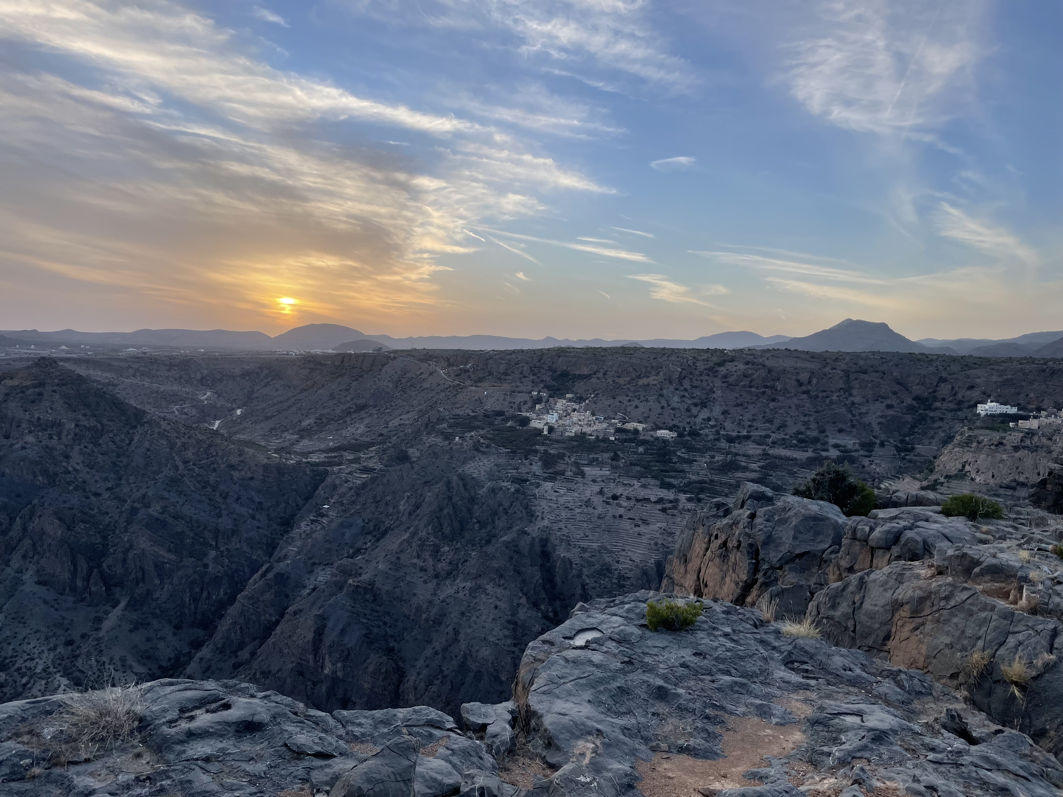 - Observer le coucher de soleil au Diana’s Viewpoint : Diana’s Viewpoint est en fait une plateforme en verre au-dessus du vide, située dans le plus luxueux des resorts du Jebel Al Akhdhar, Anantara Al Jabal Al Akhdhar Resort. Alors imaginez un peu la scène : après avoir garé notre 4×4 tout sale entre une Ferrari et une Lamborghini, on arrive à l’accueil d’un resort 5* en tenue de rando, persuadés qu’on allait se faire recaler (un peu comme à l’entrée d’une boite de nuit). C’est vrai qu’on détonnait un peu dans ce décor 😄 Finalement, le personnel nous a aimablement indiqué où se situait le fameux Diana’s Viewpoint sans poser aucune question. Nous prenons la dernière table disponible sur la plateforme, commandons un « Lemon Mint » (c’est le cocktail national d’Oman à base de menthe et de citrons verts, délicieux et très désaltérant) et attendons le coucher de soleil… On n’est pas bien là ? 😎 Le resort est magnifique mais malheureusement au-dessus de notre bourse. Dommage, on serait bien resté une nuit ou deux 😁 Pensez à prendre un pull avec vous car nous sommes à 2’000m d’altitude et il fait vite frais quand le soleil se couche.
