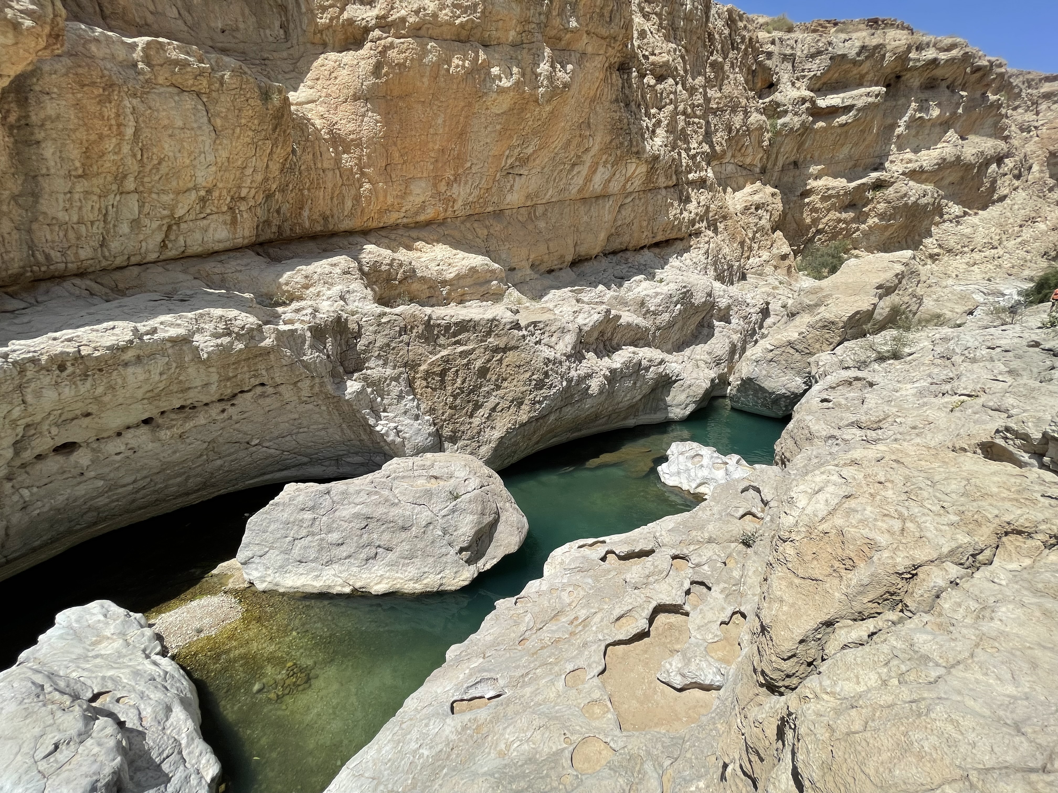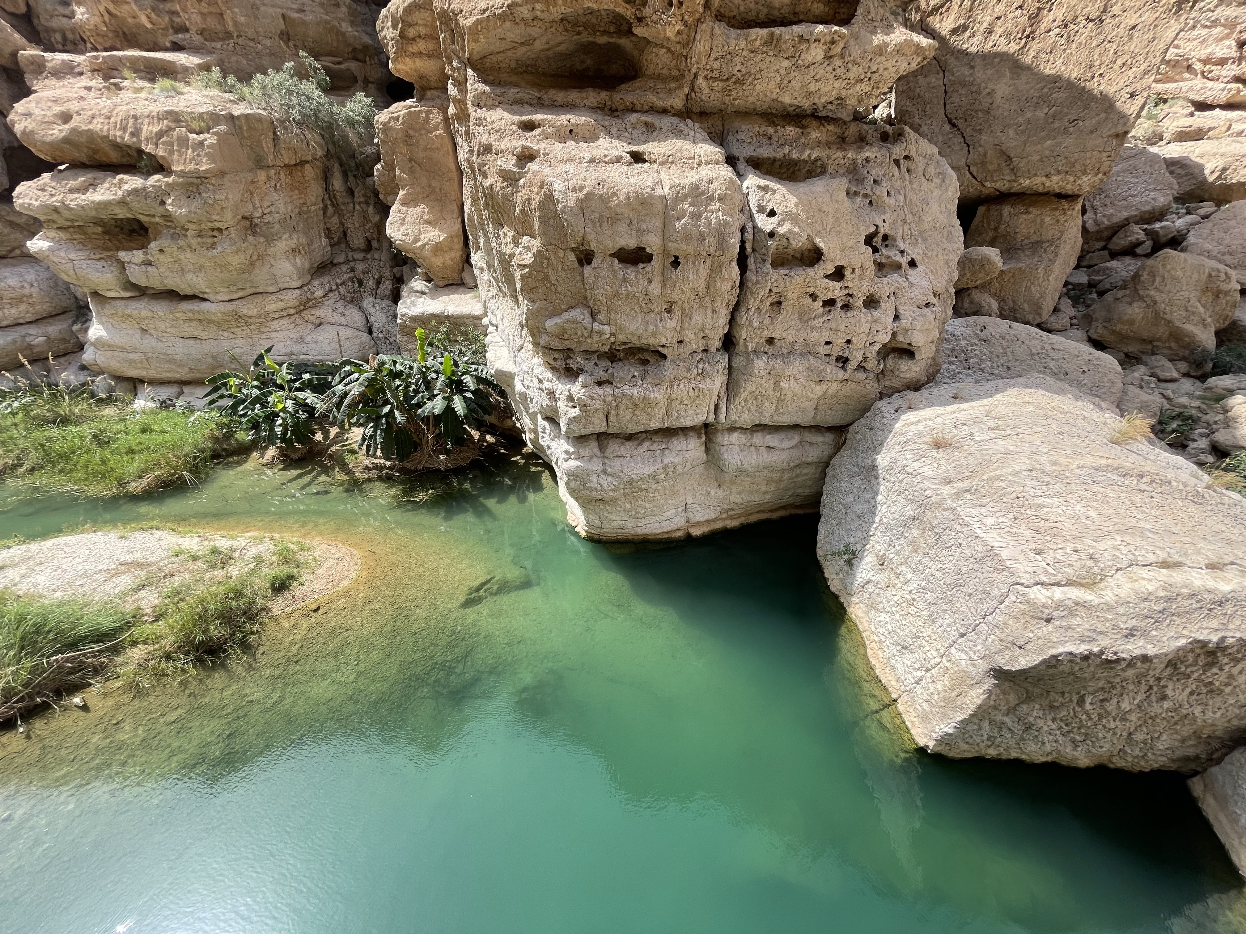 - Nager dans le Wadi Shab jusqu’à cette fameuse grotte à la fin du parcours : Après notre marche de 45 min et dès que nous le pouvons, nous nous mettons en « tenue de bain », nous rangeons nos affaires dans notre sac étanche et c’est parti mon kiki ! On enchaîne les différentes piscines naturelles d’eau turquoise, plus belles les unes que les autres. Attention, à l’inverse du Wadi Bani Khalid, les bassins sont plus grands, non aménagés et donc le temps de nage est plus important. Alors il n’est pas non plus question de faire des kilomètres à la nage mais n’étant pas une très bonne nageuse, j’étais contente d’avoir ma « bouée » (mon sac étanche) pour aller au bout du parcours. Lorsque vous arrivez dans le dernier bassin et que vous pensez qu’il est temps de faire demi-tour, vous trouverez une petite ouverture dans la roche (sur la gauche) vous emmenant dans une caverne avec une belle cascade (le passage est très étroit, vous avez juste la place pour y passer votre tête. Le reste de votre corps reste immergé). Et une fois dans cette caverne, vous avez encore la possibilité d’atteindre un dernier bassin en remontant la cascade à l’aide de la corde installée.