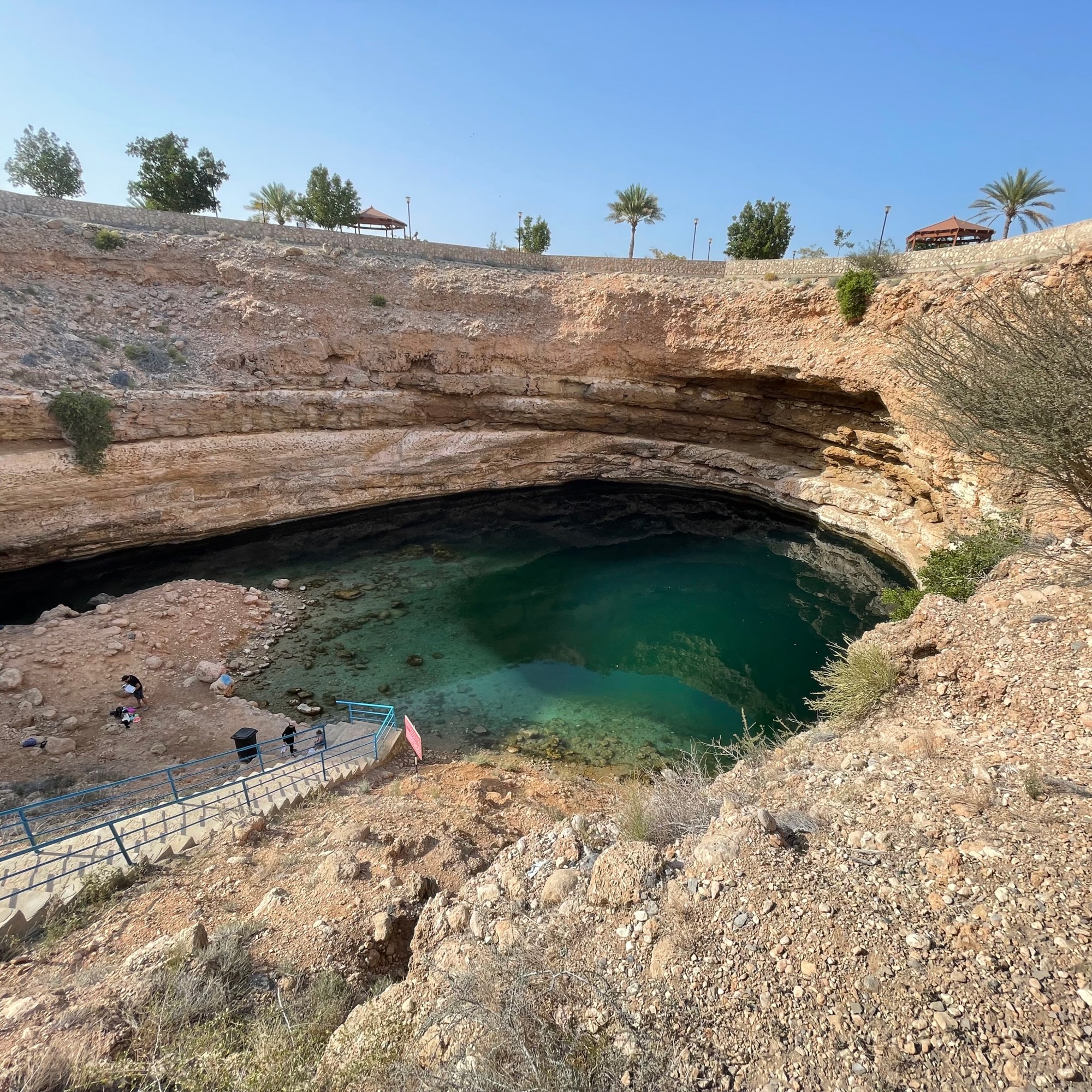L’après-midi, nous continuons notre road-trip avec pour objectif de rentrer à Mascate le soir. On s’arrêtera sur la route au Bimmah Sinkhole, cette curiosité de la nature qui est en fait un énorme gouffre où on peut se baigner (l’eau est plutôt fraîche mais l’avantage d’y aller en fin de journée, c’est qu’on est presque seul au monde).