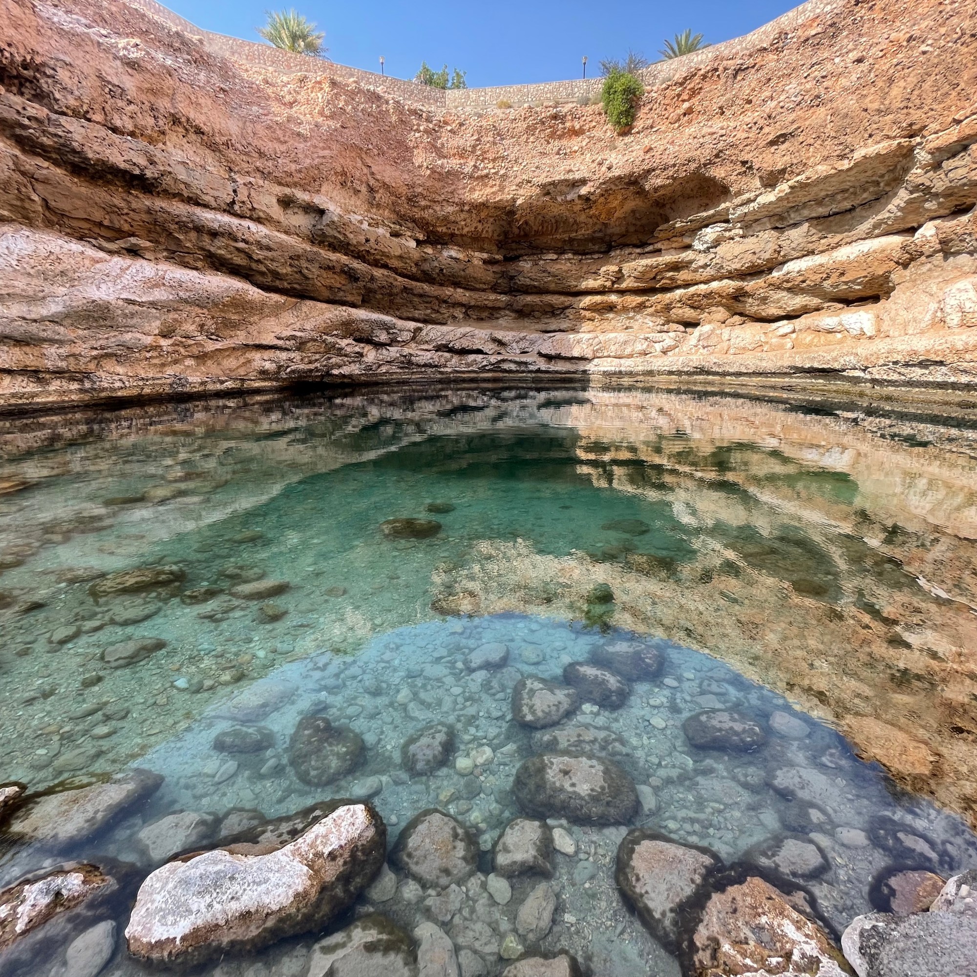 Profiter des eaux turquoises du Wadi Bani Khalid : Ce wadi est assez populaire puisqu’il est pseudo-aménagé. Il y a un parking à l’entrée et même une sorte de buvette / cafétéria (fermée quand on y était) proche du bassin principal. Nous vous conseillons d’ailleurs d’arriver tôt le matin et d’éviter les jours de weekend (vendredi et samedi) pour être plus tranquille. Etant en fin de saison, l’eau des premiers bassins était assez trouble, nous avons donc préféré nous éloigner de l’entrée puisque ce ne sont pas les piscines naturelles qui manquent. Nous avons également rencontré de jeunes omanais qui nous ont guidé à travers les différentes piscines et qui nous ont proposé de visiter une grotte dans laquelle il y a une cascade au bout (Cyril m’a abandonné à l’entrée, je me suis donc retrouvée seule dans une grotte avec un inconnu 😅 Tout s’est bien passé mais je vous avoue que je n’étais pas rassurée). Quelques conseils : n’oubliez pas que vous êtes dans un pays mulsuman et même si c’est un lieu touristique, le port du maillot de bain peut choquer les locaux. Nous nous sommes donc baignés en T-Shirt, avec un legging de sport (pantacourt) pour moi et un short de bain pour Cyril. Nous vous conseillons également d’avoir avec vous un sac étanche pour pouvoir emmener vos objets de valeur durant votre baignade.