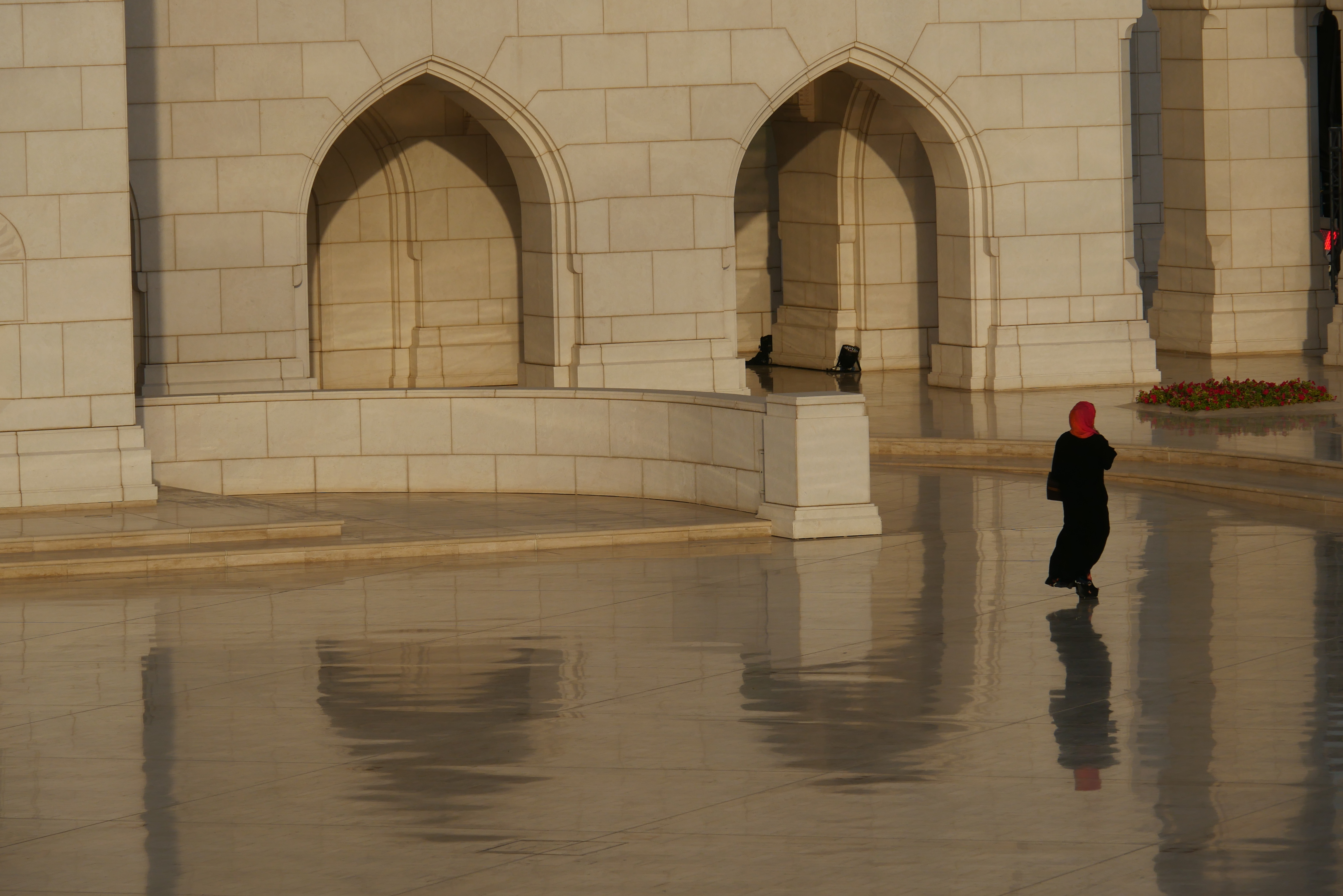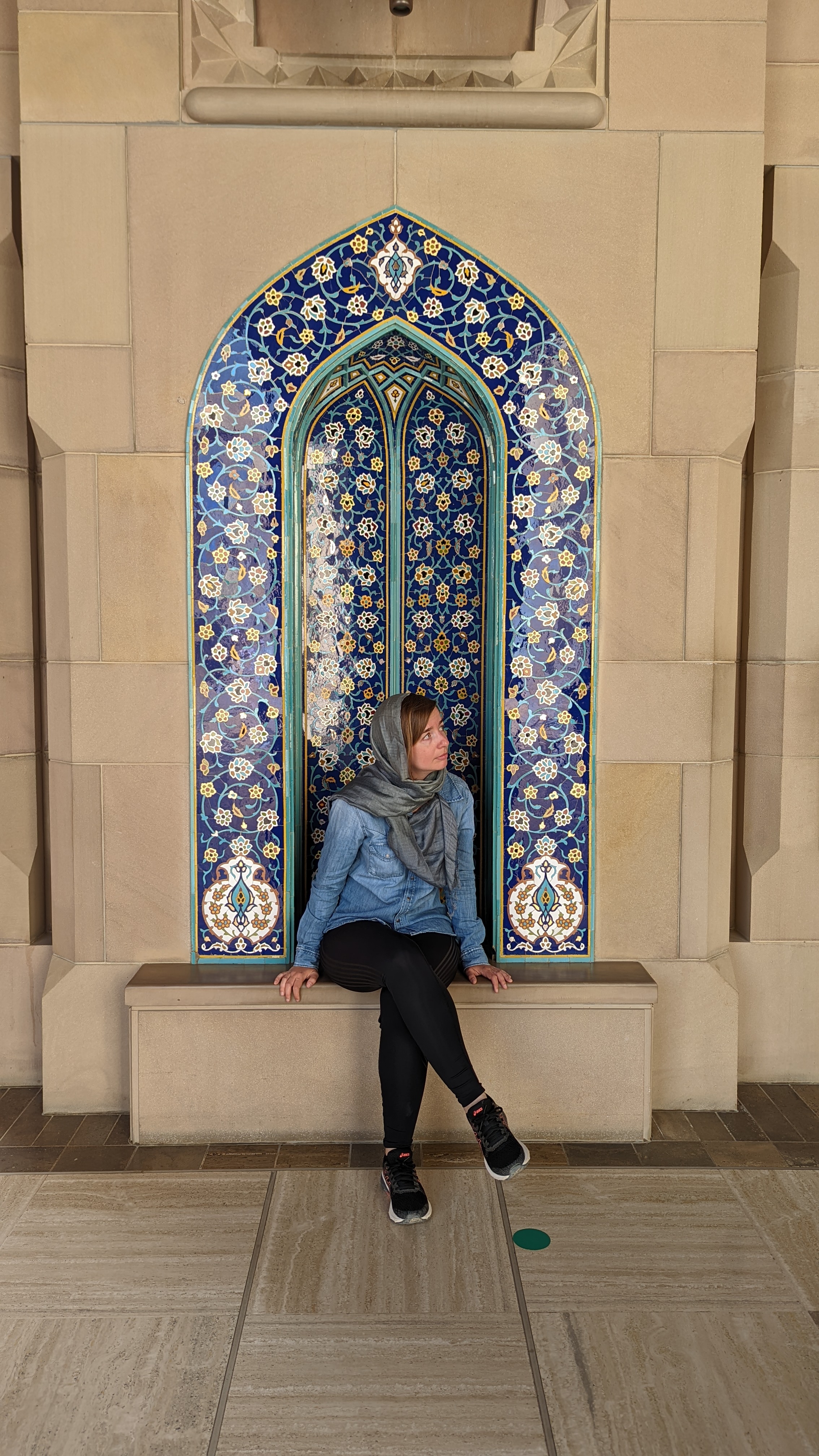Avant de poursuivre, 2-3 petites consignes à respecter pour visiter la Mosquée 🙃 Pour les femmes, vous devez avoir les jambes (jusqu’aux chevilles), les bras et les épaules couvertes. Vous devrez également porter un voile. Pour vous messieurs, c’est pareil, le voile en moins. Il me semble avoir croisé des hommes en t-shirt mais par respect pour le lieu et les omanais, je vous conseille quand même de porter des manches longues. Avant d’entrer dans les salles de prière, vous devrez à chaque fois vous déchausser (des casiers sont prévus à cet effet à l’entrée de chaque salle).
